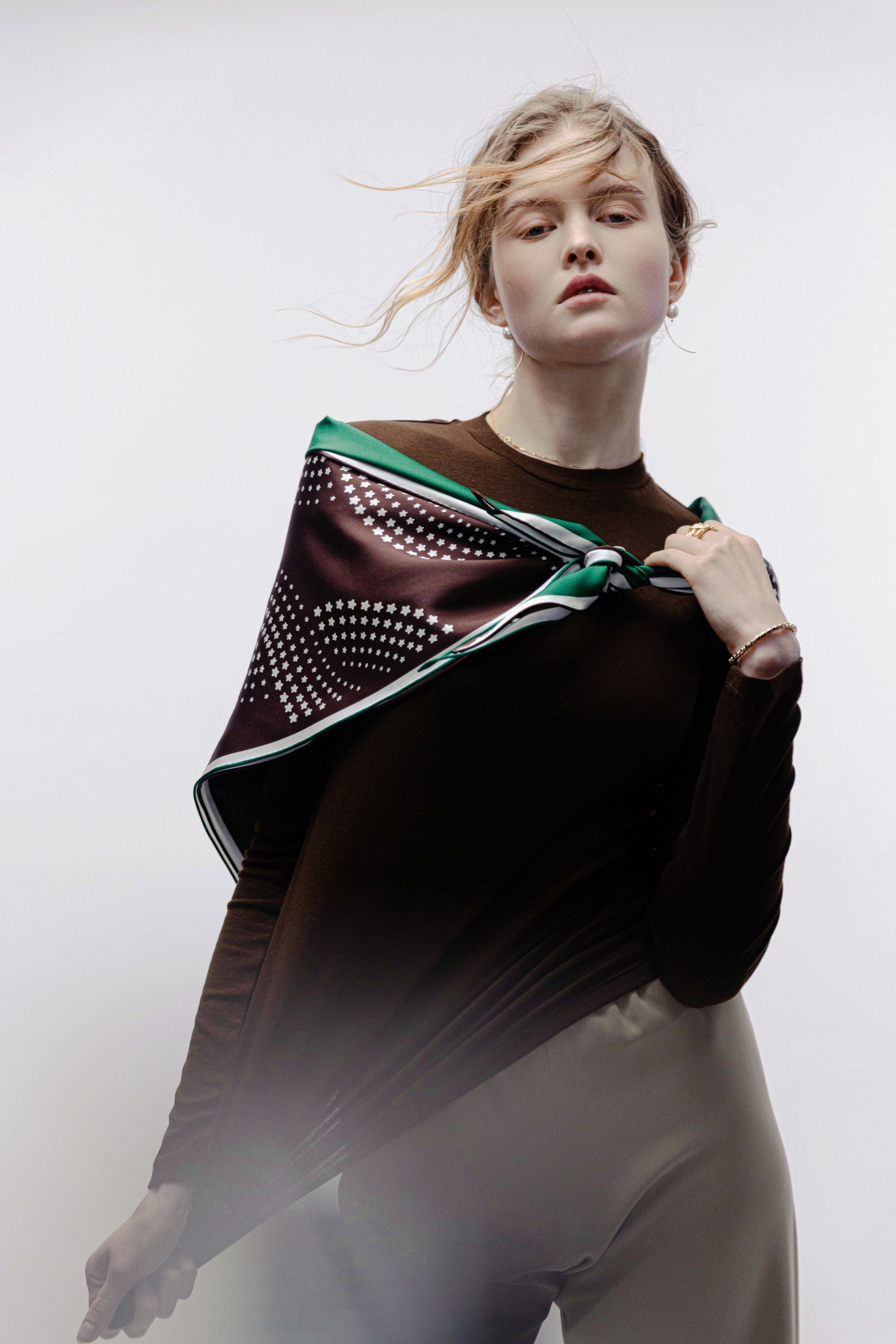 可系成髮髻或披於肩上,折疊成三角形飾於頸部